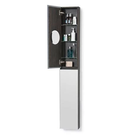 This stylish slimline tall mirror cabinet is a great addition for any modern bathroom. It’s slimline design makes it ideal for bathrooms where space is limited. The cabinet can be mounted for either left or right hand door opening and houses six adjustable tempered glass shelves. The cabinet also features a 5x magnification mirror on the top doors internal side for a close up view. Beautifully crafted from white oak and oak veneers and finished with a dark stain water resistant lacquer.