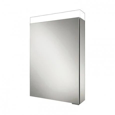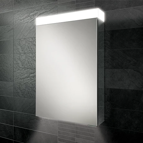 The HIB Apex Single door bathroom mirror cabinet with LED illumination, ambient under cabinet lighting and mirrored sides.