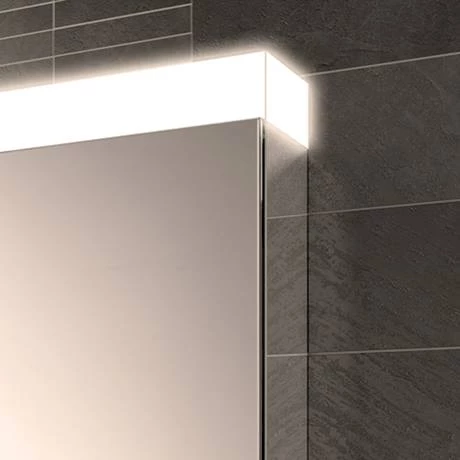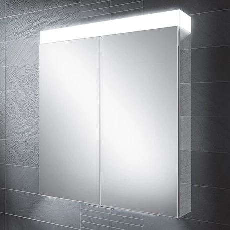 The HIB Apex 80cm double door bathroom mirror cabinet with LED illumination, mirrored sides and two charging sockets.