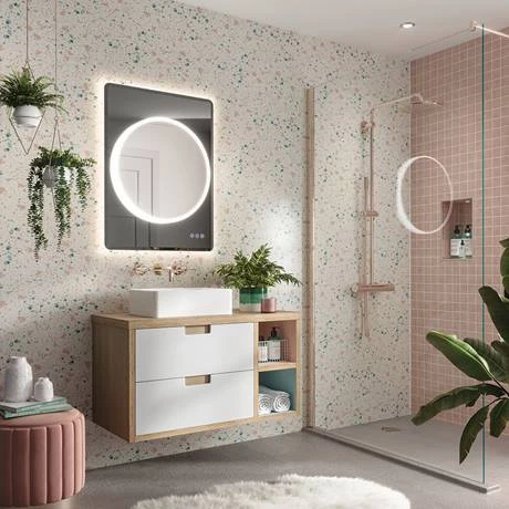 The Frontier features a circular central mirror bordered by a band of intense light, tempered perfectly by a dramatic background of smoked grey glass. Ambient backlight adds a further layer to the look, casting a soft glow onto the surrounding walls. The look is softened with rounded corners and bevelled edges. Frontier’s discreet touch controls allow you to adjust the brightness and colour temperature of the light to suit your décor and mood while the internal heated pad helps keep the glass clear of condensation.