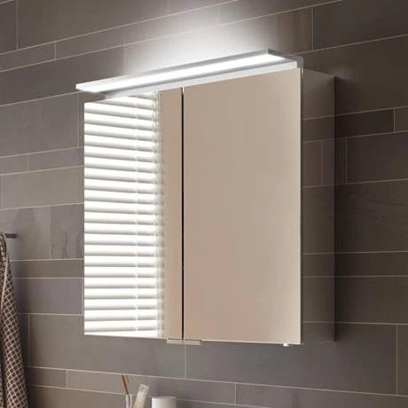 The Royal L1 650mm 2-Door LED Mirror Cabinet with its slender design prominently features overhead LED lights made of light-conducting material in an unobtrusive chrome plated frame. The LEDs provide frontal room lighting and indirect wall lighting. During the night the additional LED washbasin lighting serves as an orientation light. Together they offer ample light to illuminate the entire room. All three lighting scenarios can be steplessly controlled with the intuitive rotary dimmer, which always remembers the most recent setting.