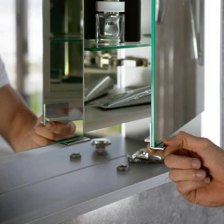 The Royal Lumos 800mm Semi-Recessed LED Illuminated Mirror Cabinet sparkles with design and reflects quality made in Germany. The mirror cabinet features double sided mirror doors, the rear and side walls also have mirrored inner surfaces and the height of the glass shelves can be adjusted. The soft close hinges mean that the doors shut lightly and softly. A premium shelf inlay made of linoleum offers a scratch-free shelf surface for watches or jewellery. The colour and intensity of the high performance LEDs behind the surrounding translucent frame can be adjusted from a daylight white light, ideal for daily care, to a warm-white light, for a perfect evening makeup or an atmospheric bathing ambience.